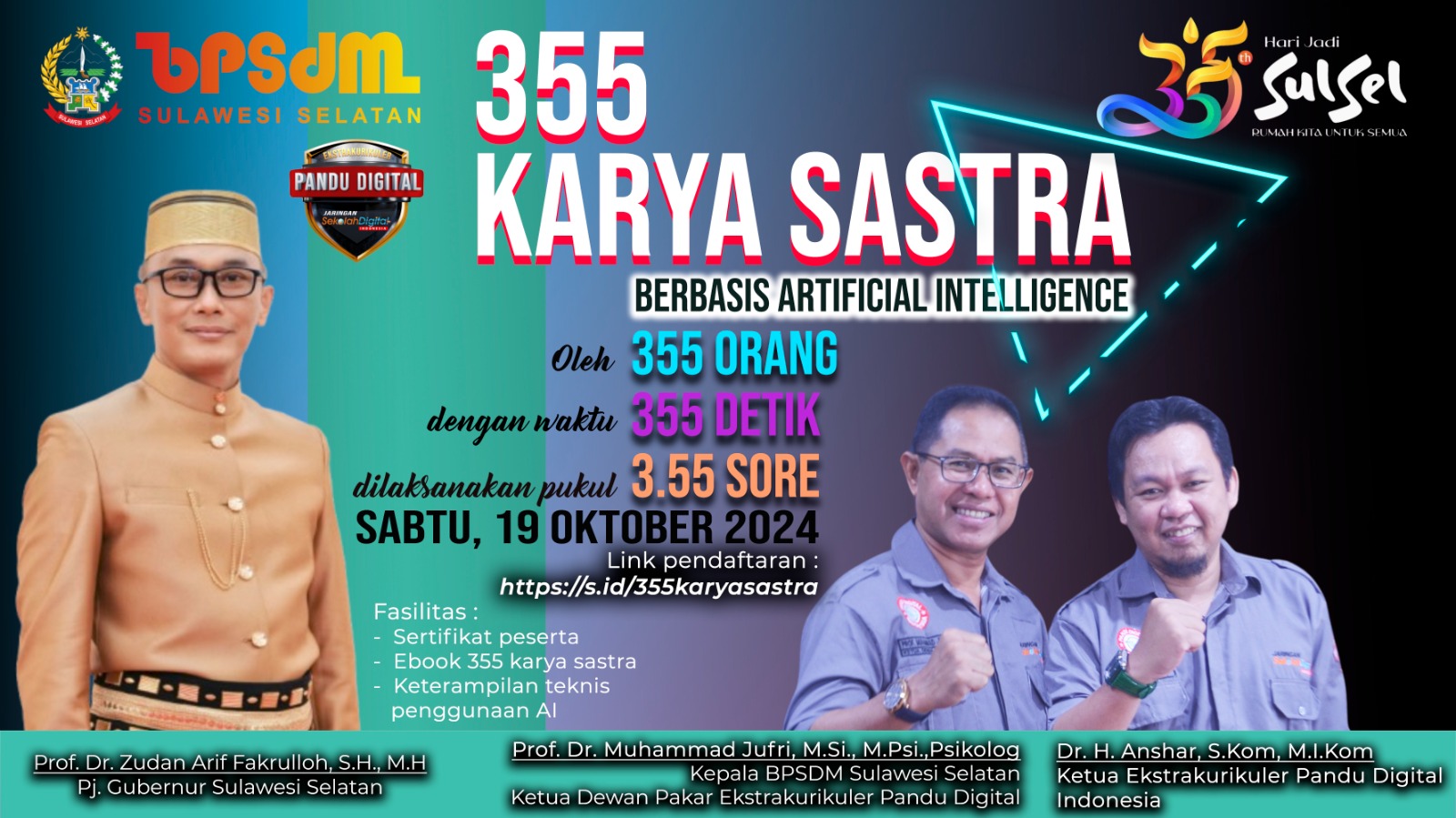 Pada tanggal 19 Oktober 2024, Badan Pengembangan Sumber Daya Manusia (BPSDM) bekerja sama dengan Pandu Digital akan menyelenggarakan Lomba 355 Karya Sastra Berbasis AI. Lomba ini terbuka untuk berbagai kalangan, termasuk Aparatur Sipil Negara (ASN), pelajar, guru, dan tenaga kependidikan, menjadikannya ajang yang unik dan inklusif.