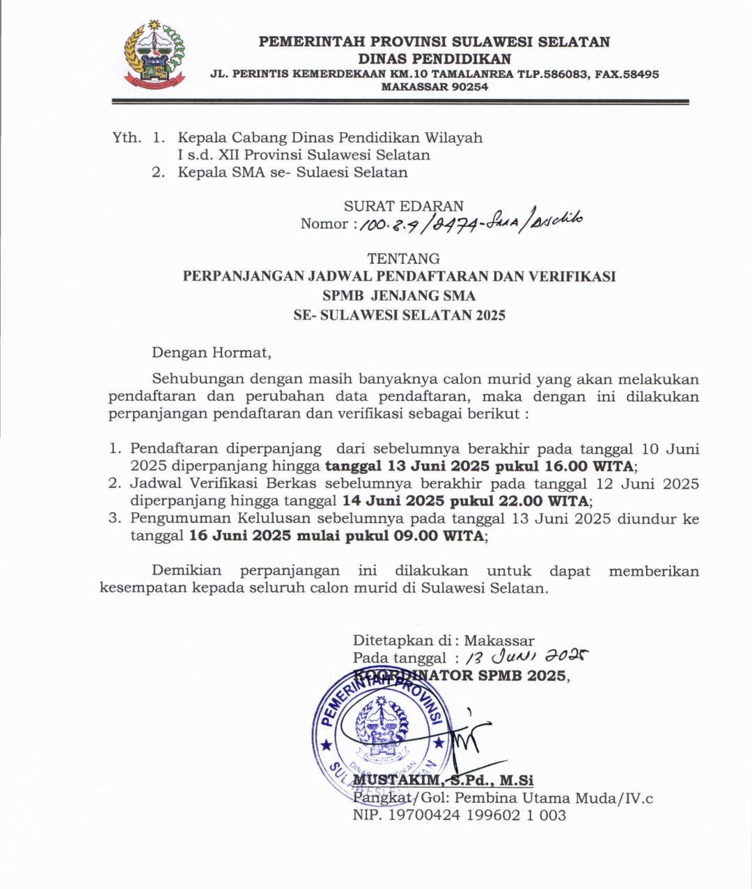 Makassar – 13 Juni 2025- Dinas Pendidikan Provinsi Sulawesi Selatan secara resmi mengumumkan perpanjangan jadwal pendaftaran dan verifikasi Seleksi Pen...